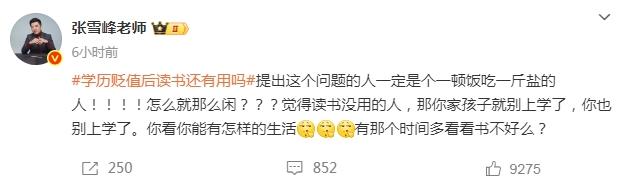 张雪峰怒斥提出这个问题的人,称其“一定是个一顿饭吃一斤盐的人”,并表示:“怎么就那么闲?觉得读书没用的人,那你家孩子就别上学了,你也别上学了。你看你能有怎样的生活,有那个时间多看看书不好么?”